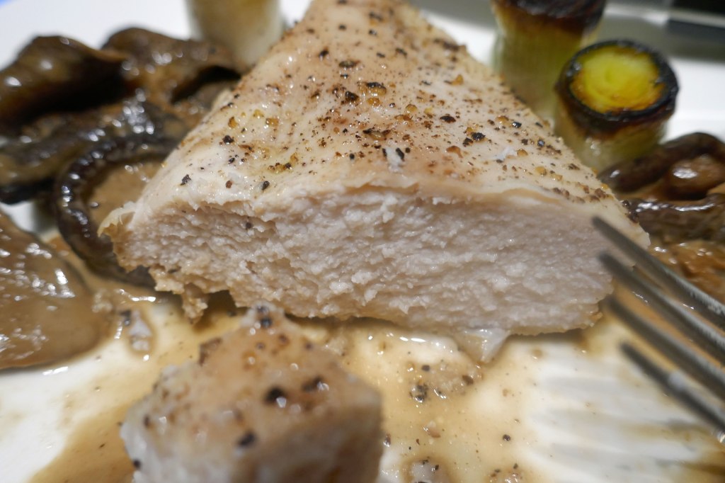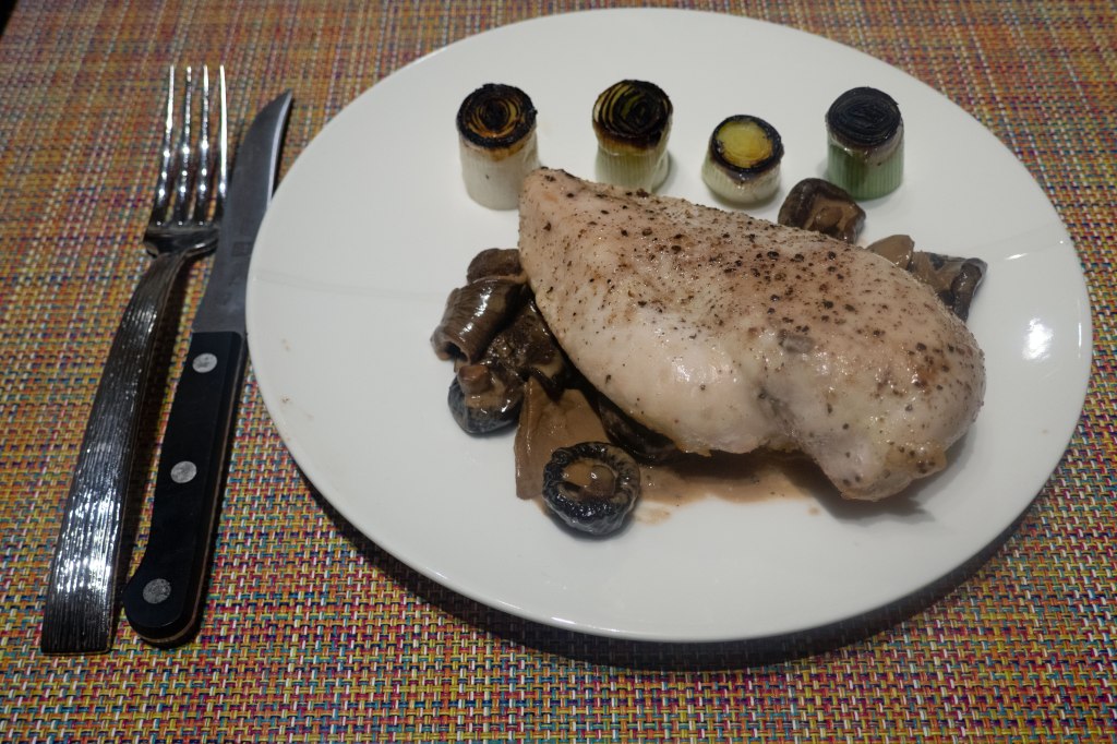 1. Mettre des champignons et leur sauce sur une assiette. Déposer une supreme au-dessus. Mettre des poireaux autour de la supreme et servir.