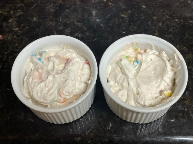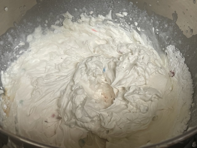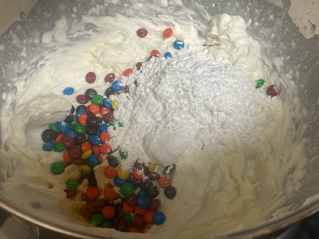 - Y mettre le mascarpone, la crème liquide, le sucre glace, et la vanille liquide. J’ai tout fouetté sans me souvenir du sucre glace et de la vanille. J’ai donc dû les ajouter avec les M&Ms.