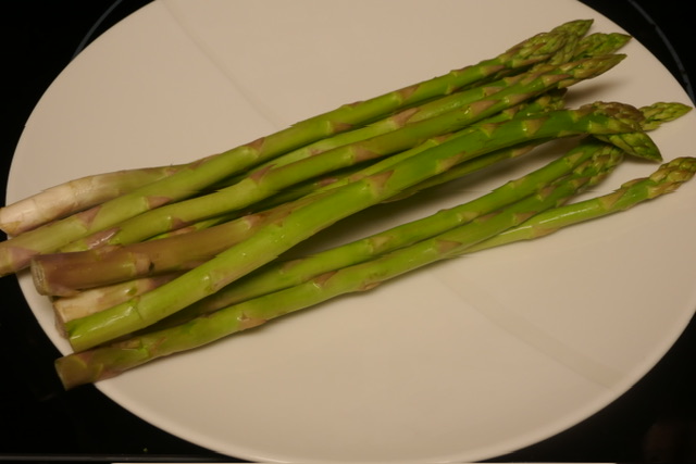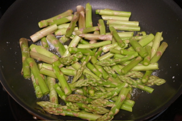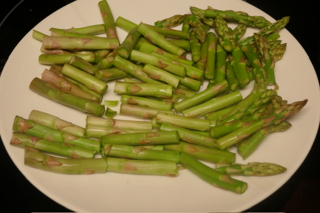 - Nettoyer et couper les asperges en tronçons de 2 cm.