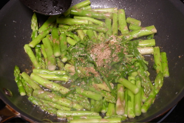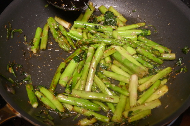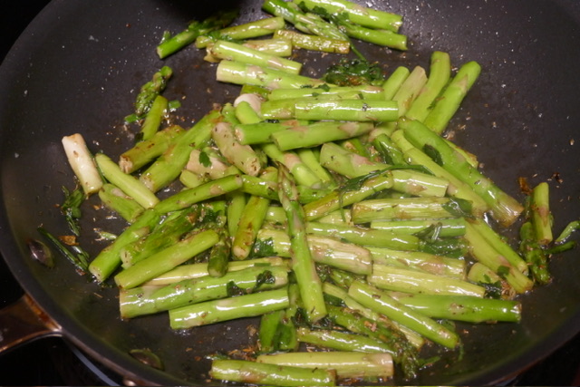 - Faire revenir les asperges avec la moitié du beurre dans une poêle assez grande pour l’omelette. Ajouter la moitié du persil et de la ciboulette, la muscade et le thym.