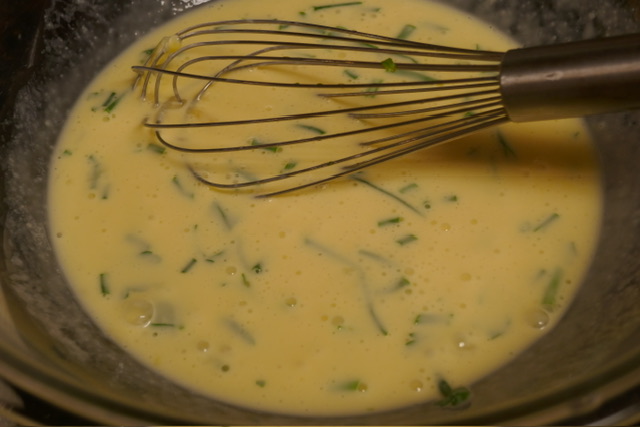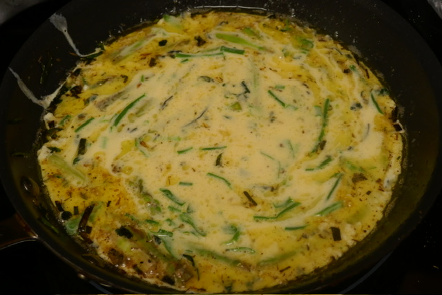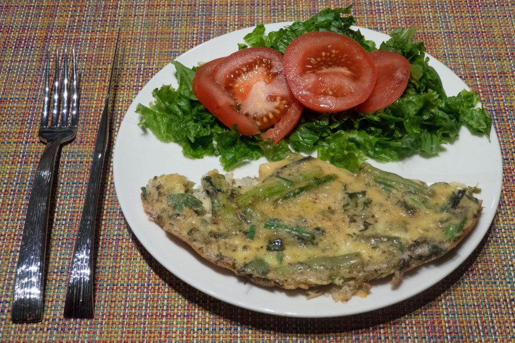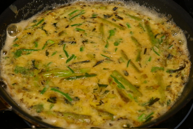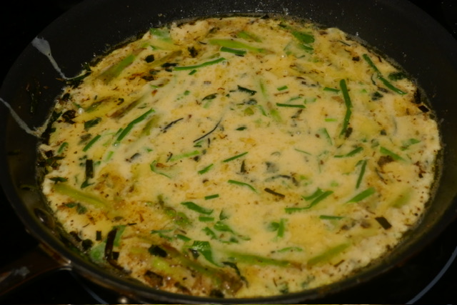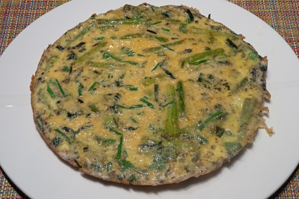 Notre plat principal est l’omelette d’asperges. C’est un bon plat, mais…pour un roi ? Sans viande ? Je ne sais pas. De toute façon, il me semble que c’est bon à avoir une autre omelette dans notre boîte à outils. J’ai supprimé l’oignon, et coupé la quantité par deux.