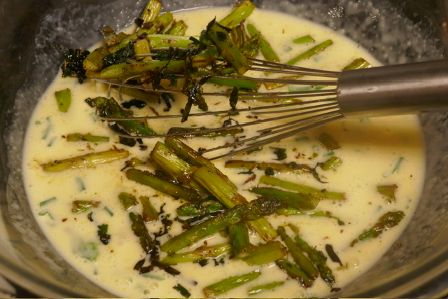 - Dans un saladier, battre les œufs avec la crème et le reste des herbes pendant que les asperges se font cuire.