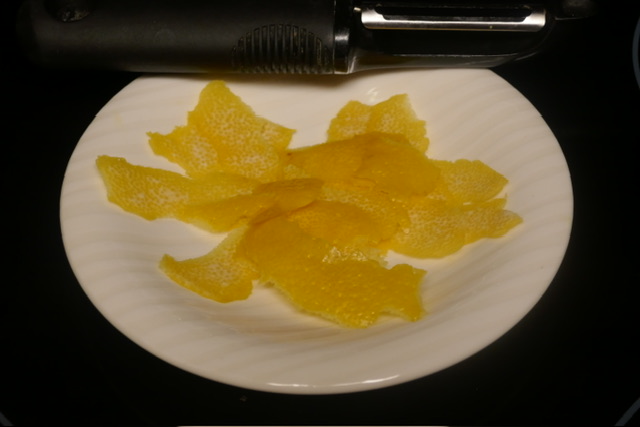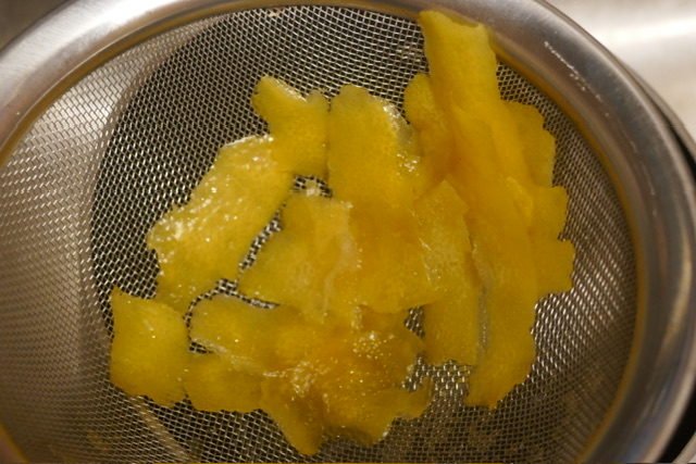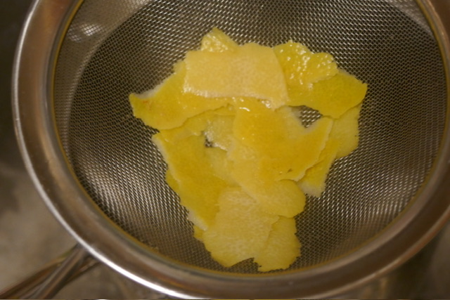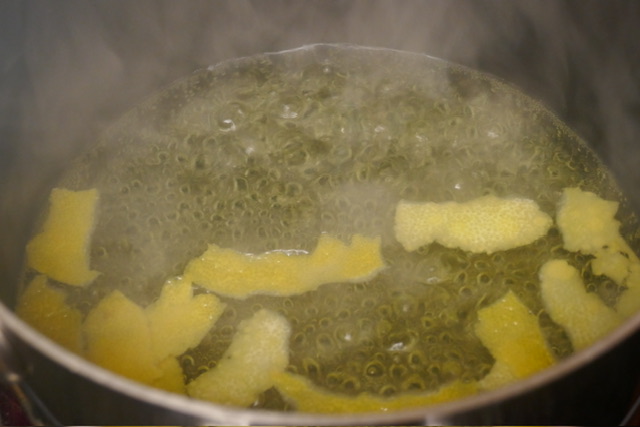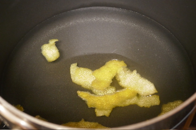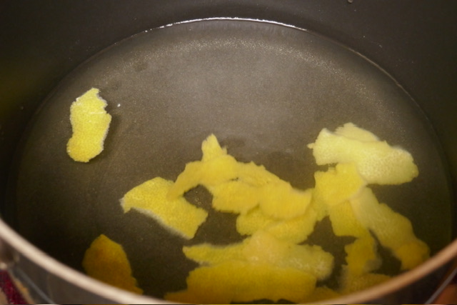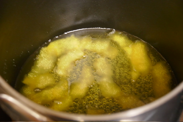 - Mettre l’écorce dans le sirop, porter à ébullition, baisser le feu à moyen, et laisser faire cuire pendant 10 minutes. J’ai égoutté les écorces après ça. Peut-être que j’aurais dû garder le sirop, mais je vous promets que ça marche merveilleusement quel que vous fassiez.