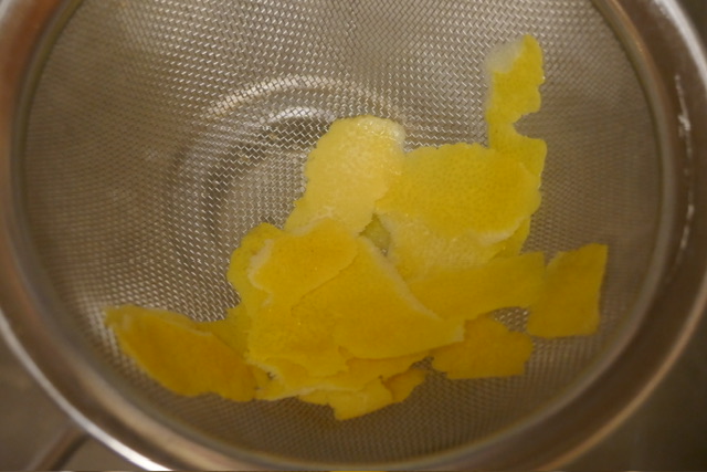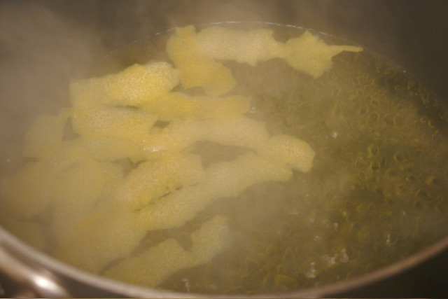 - Avec un économe, éplucher le zeste du citron. Mettre l’écorce dans de l’eau et porter à ébullition. Égoutter et faire à nouveau avec plus d’eau froide.