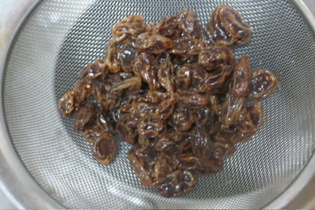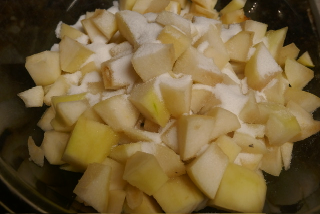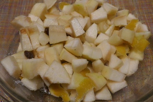 - Vider et éplucher les poires. Les couper en petits morceaux. Mettre les morceaux de poire dans un grand saladier avec 100 grammes de sucre, les raisins égouttés, les écorces, les pignons, et la cannelle. Mélanger bien et laisser reposer pendant 1/4 heure.