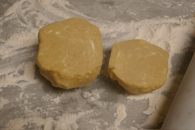 - Couper la pâte en deux boules (60 %/40 %). Étaler la plus grande boule et garnir le fond du moule à tarte.