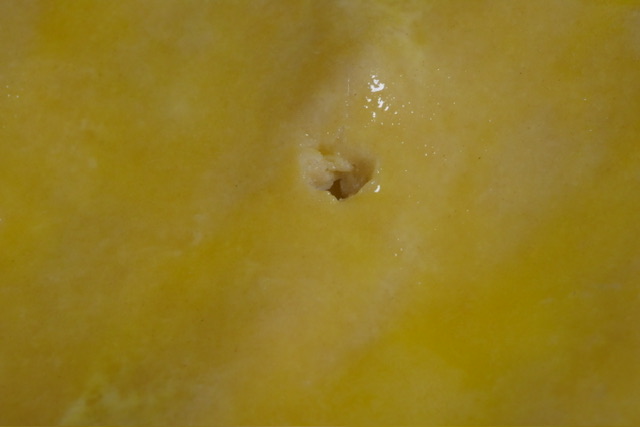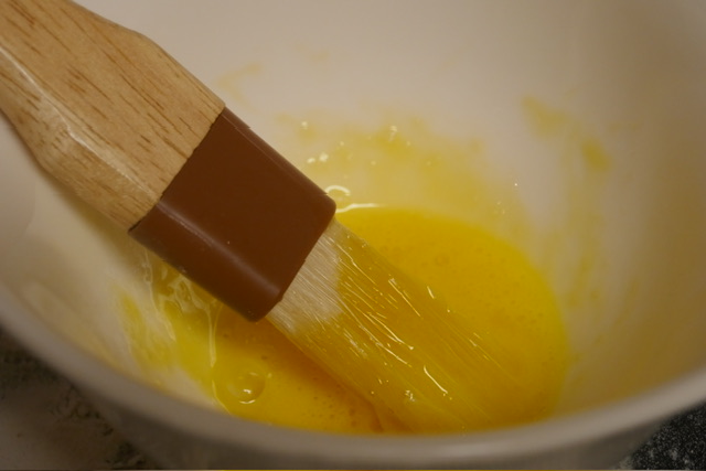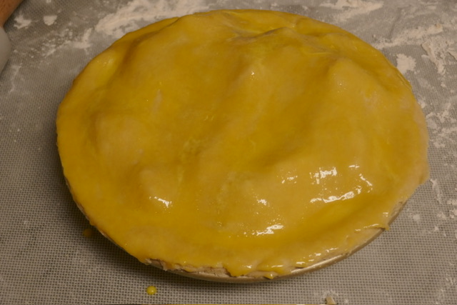 - Badigeonner le couvercle avec 1 jaune d’œuf. Couper un petit trou au centre et le garder ouvert avec soit un petit entonnoir en carton soit des cure-dents comme moi. Pas de carton à l’époque de Louis XIV !
