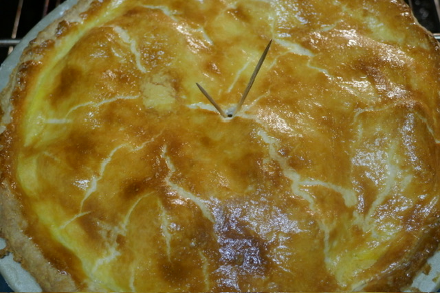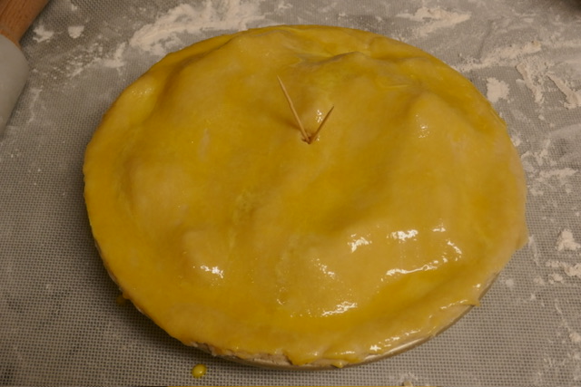 - Mettre la tourte dans le four pendant 1 heure et surveiller avec la lumière. Une fois le couvercle est assez doré pour l’appeler Julien, retirer les cure-dents et couvrir légèrement avec une feuille d’aluminium.
