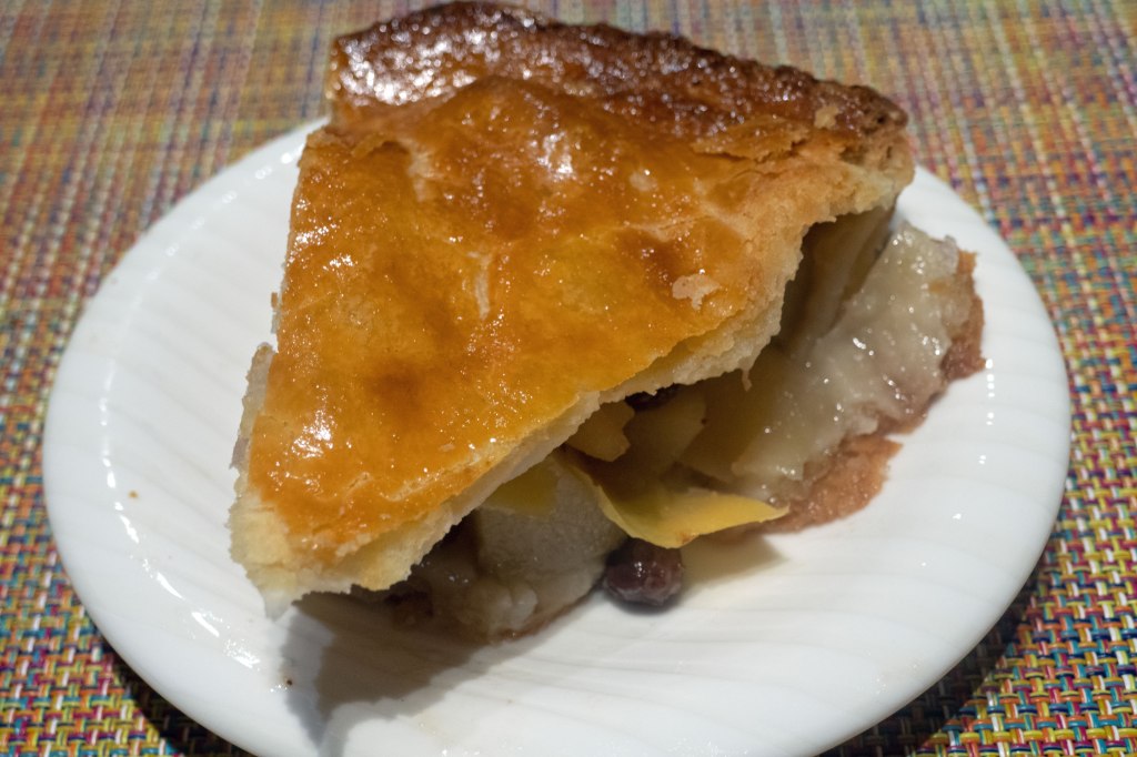 La tourte à la chair de poire est à un pas d’être un candidat pour le meilleur dessert du blog. Vous pensez que je suis fou. Mais le goût avec le zeste de citron confit, oh là là, c’est presque parfait ! Mais je cuirais les poires dans une poêle avant de les mettre dans la pâte pour bien réduire la quantité de jus. Après avoir coupé la première tranche, j’ai décidé d’égoutter la tourte sur l’évier. Peut-être que je ferais ça avec une eau de vie, et tremper aussi les raisins secs dans du rhum au lieu d’eau. J’ai supprimé les pignons car ils sont sacrément chers ici. Dans tout ce jus, ça aurait été gaspillé.