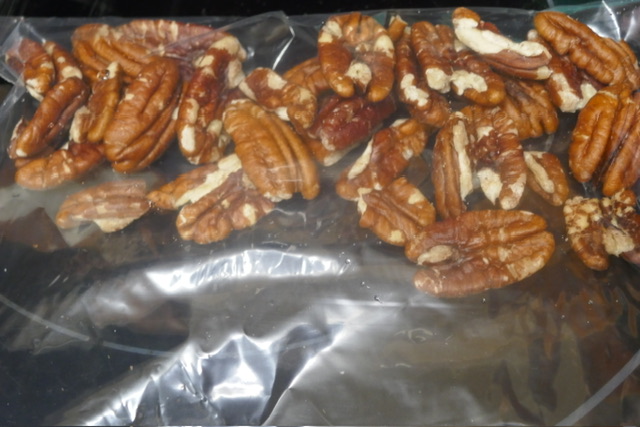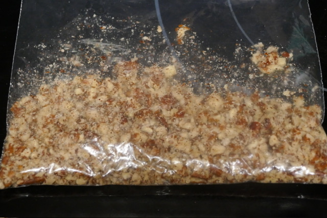 - Mettre les noix de pécan dans un petit sac en plastique. Écraser en éclats avec un rouleau. On ne veut pas une poudre, car on veut que la garniture soit croustillante comme la tarte. Mais écraser assez bien pour ne pas bloquer une douille plate.
