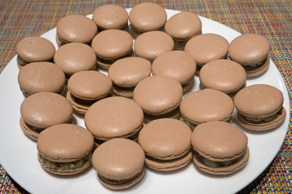 La recette de la garniture est EXACTEMENT celle de la tarte, coupée en deux (assez pour une trentaine de macarons), mais cuite de façon différente, car il n’y a pas de croûte. La recette des coques est ma meringue française habituelle, appris de Cook&Record. Un chef expérimenté pourra être prêt à remplir les coques 1 heure après le début — tout arrive vite !