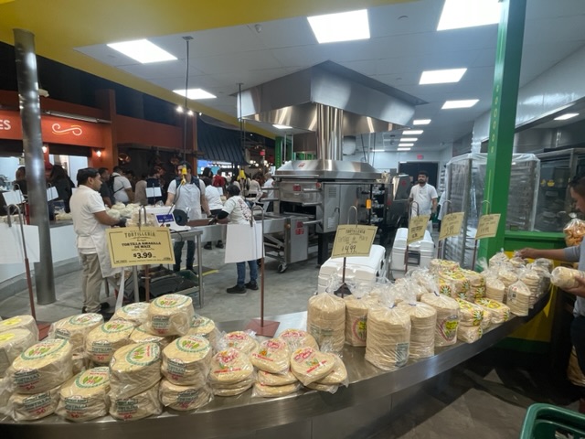 Je veux diriger votre attention vers la machine à tortillas, une nécessité dans n’importe quel supermarché mexicain. Les tortillas sont vendus dès qu’elles sont fabriquées : pas du tout chères, elles ne seront pas bonnes le lendemain, surtout celles à base de farine de maïs (je les ai fabriquées pour vous en 2022). C’est la baguette à la mexicaine, dans tous les sens.