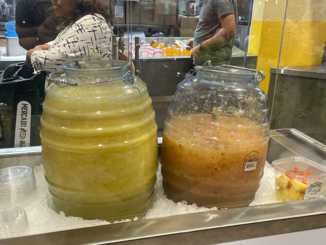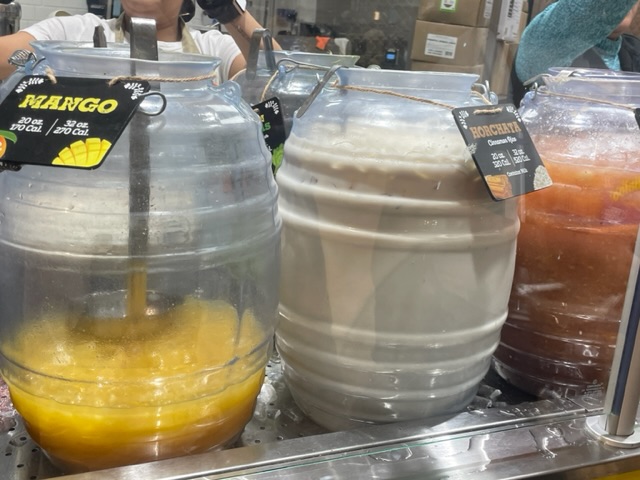 Les « aguas frescas », littéralement « eaux fraîches », sont des boissons sans alcool à base de jus de fruits, sauf pour la horchata (à droite), à base de lait, au riz et à la cannelle :