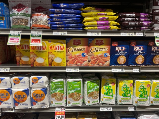 Passons par les ingrédients secs. La maïzena, vous en avez entendu parler ? Mais ici, c’est à côté de la pâte à churros. Nous ne sommes plus au Kansas, Toto ! (Peut-être à Michoacán.) Au fait, la farine « Gold Medal » en bas à gauche apparaît dans presque toutes mes recettes ; c’est la marque de farine aux États-Unis. (Celle de King Arthur est meilleure, mais beaucoup plus coûteuse.)