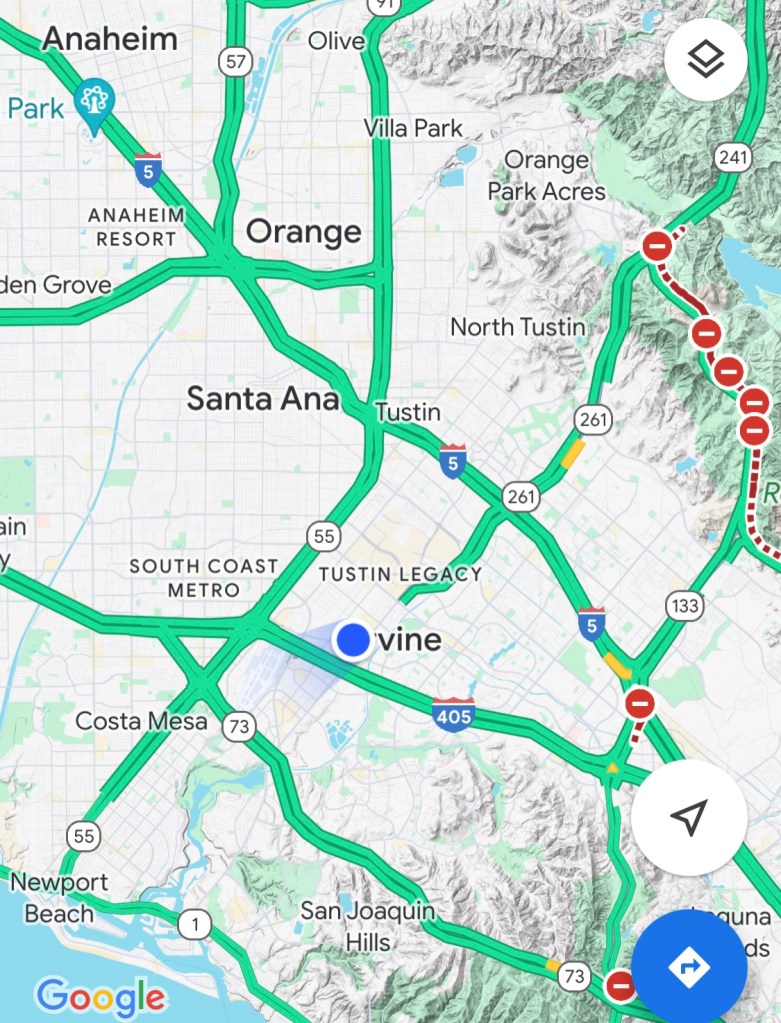 Le point bleu, c’est évidemment Elbe-en-Irvine. En haut à gauche où la légende dit « Anaheim Resort » ? C’est le quartier de Disneyland et les nombreux hôtels qui l’entourent. Vous avez sûrement remarqué la ville de Tustin, un nom que je déteste car trop proche d’un autre. Je pense souvent à adopter la prononciation française de mon prénom même en anglais pour mettre un terme aux commentaires stupides que je reçois depuis déjà 23 ans. ([Ça a commencé ily a beaucoup plus longtemps. Justin Time et Justin Case n’ont rien à voir avec la géographie ! — M. Descarottes]) Au fait, Paris fait 105 km carrés — Irvine en fait 170. Comprenez-vous pourquoi il n’y a pas de métro ? Les distances sont énormes. Mercado Gonzalez se trouve le long de l’autoroute 55, à mi-chemin entre les noms Costa Mesa et Newport Beach, à 10 km de chez moi. Pouvez-vous imaginer aller aussi loin pour faire des courses ?