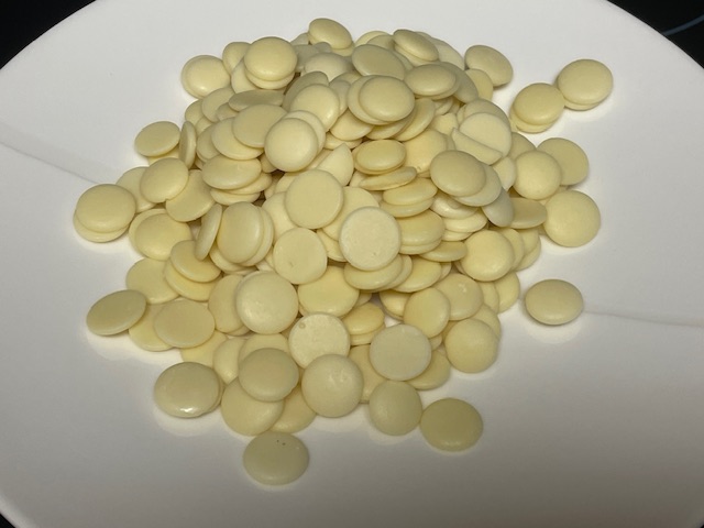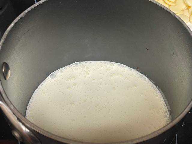 1. Préparer la ganache : si vous avez une tablette de chocolat blanc, la hacher. Sinon, mettre les pistoles de chocolat (et 15 grammes de beurre ramolli, facultatif) dans un bol. Porter la crème liquide à ébullition, puis la verser au-dessus du chocolat. Mélanger jusqu’à ce que le tout soit homogène. Recouvrir avec du film au contact et laisser reposer 2-4 heures au frigo.