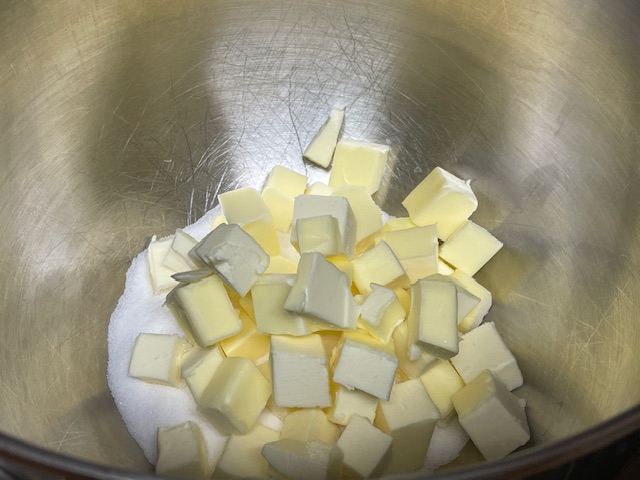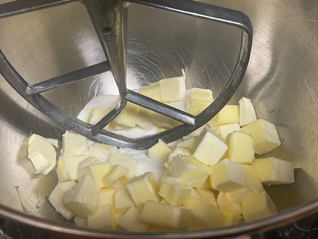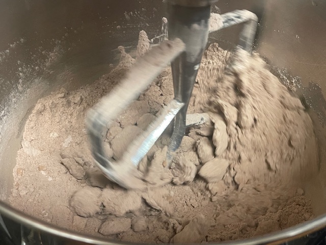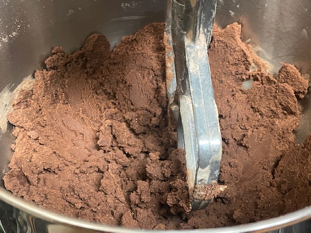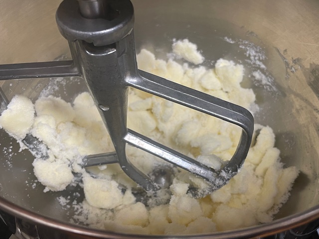 1. Dans le bol d’un robot pâtissier équipé de la feuille, mettre le beurre ramolli et le sucre. Battre à petite vitesse, et ajouter peu à peu les ingrédients secs. Continuer à battre jusqu’à ce que la pâte se tienne. Ça peut prendre du temps ; soyez patient.