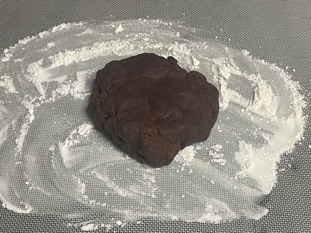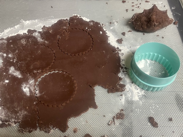 2. Fariner un plan de travaille. Laisser la pâte atteindre température ambiante puis l’étaler à une épaisseur d’environ 3 mm. Avec un emporte-pièce de 76 mm, ça vaudra environ 15 TKOs complets. Mettre les biscuits sur une plaque de cuisson recouverte d’un tapis en silicone.