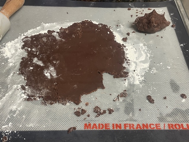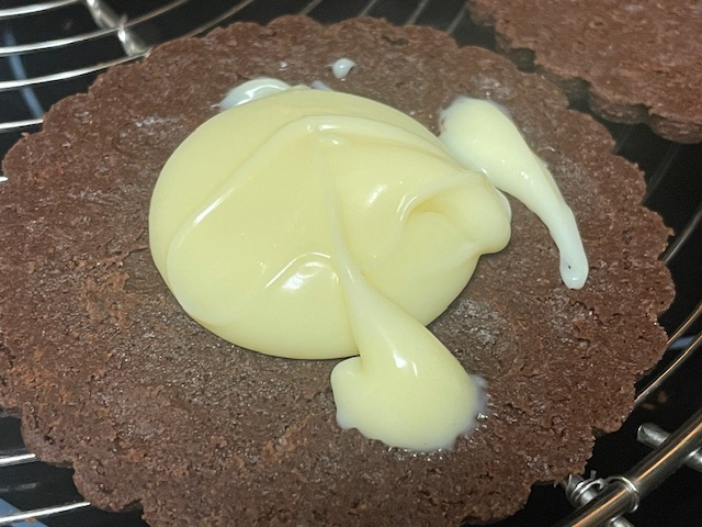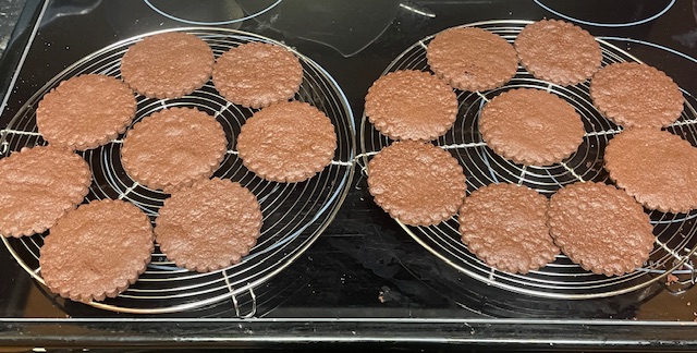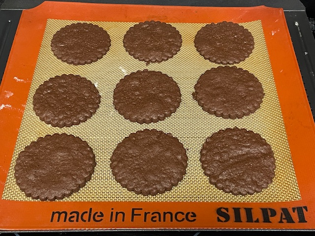 Au fait, mon emporte-pièce fait 76 mm de largeur, la taille suggérée par Messrs Keller et Rouxel. Les quantités sont celles du livre pour les biscuits. Par contre, pour la ganache, j’ai suivi la version du magazine Saveur avant de retrouver le livre, alors j’ai omis le beurre, comme eux.