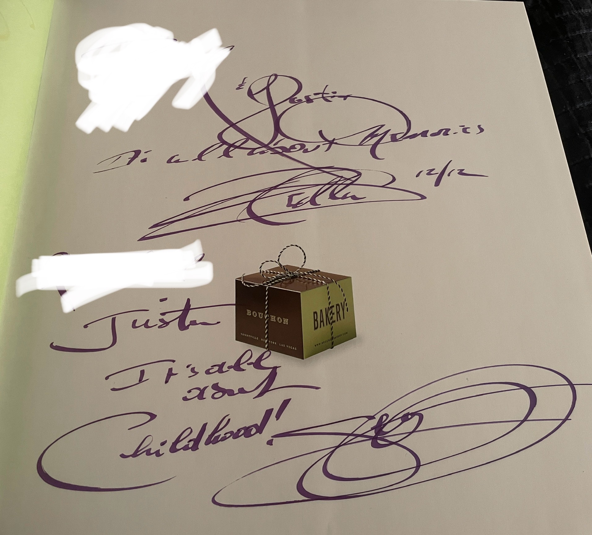 En fait, ces cookies étaient parmi les préférés de mon ex, ainsi que La Fille une décennie plus tard. Quand La Fille avait ses 3 ans, on conduisait à Los Angeles pour nous rendre chez Bouchon à Beverly Hills (il n’est plus là). J’y déjeunerais puis lui achèterais un TKO géant après. Au fait, voici une photo de moi avec le chef Keller (à votre gauche) et son chef-pâtissier Sébastien Rouxel, pris en décembre 2012 :