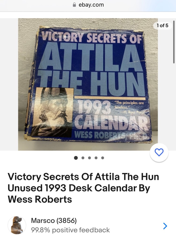 Mais avant, une petite anecdote sur mes vieux calendriers. Quand j’étais jeune, j’aimais avoir des calendriers dits « page-a-day » (une page par jour). Une année, c’était des dessins de Garfield ; une autre, de Dilbert. Mais au lycée, je suis tombé sur un calendrier dit « Les secrets de victoire d’Attila le Hun » et c’est comment j’ai passé 1993.