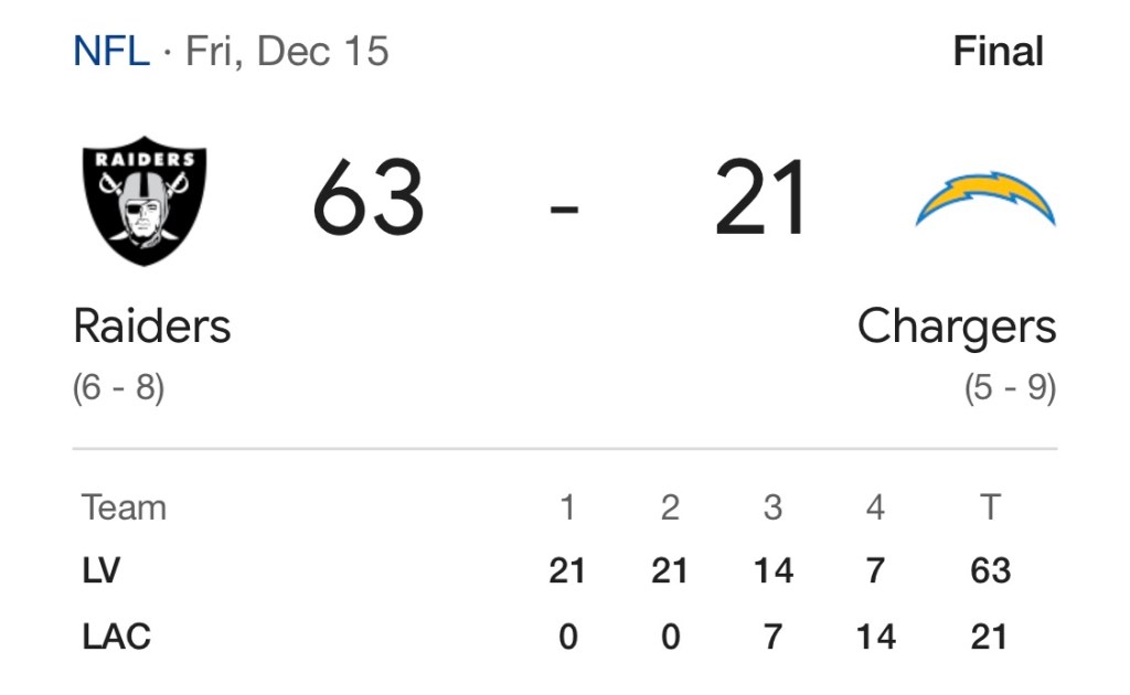 Je suis ravi de vous dire que les Chargers ont eu leur match hebdomadaire seul à la télé nationale jeudi soir — et c’était une si grosse boulette, l’équipe a viré son entraîneur le lendemain ! Les Raiders, ceux des 63 points ? Ils n’en ont marqué que 3 la semaine précédente ! Quelle humiliation !
