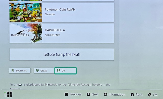 Commençons avec un calembour que j’ai vu sur les nouvelles du Nintendo Switch. L’article traitait de jeux vidéo où il fallait cuisiner (je vous rappelle le gâteau monstre de Zelda). Voici une capture d’écran avec une blague pourrie en anglais, mais qui n’a aucun sens en français :