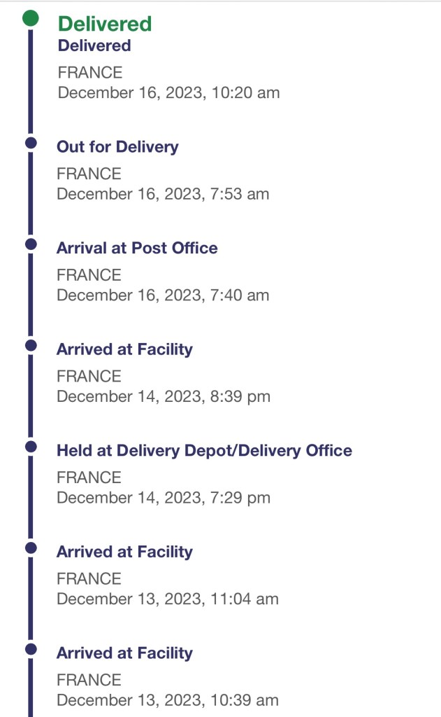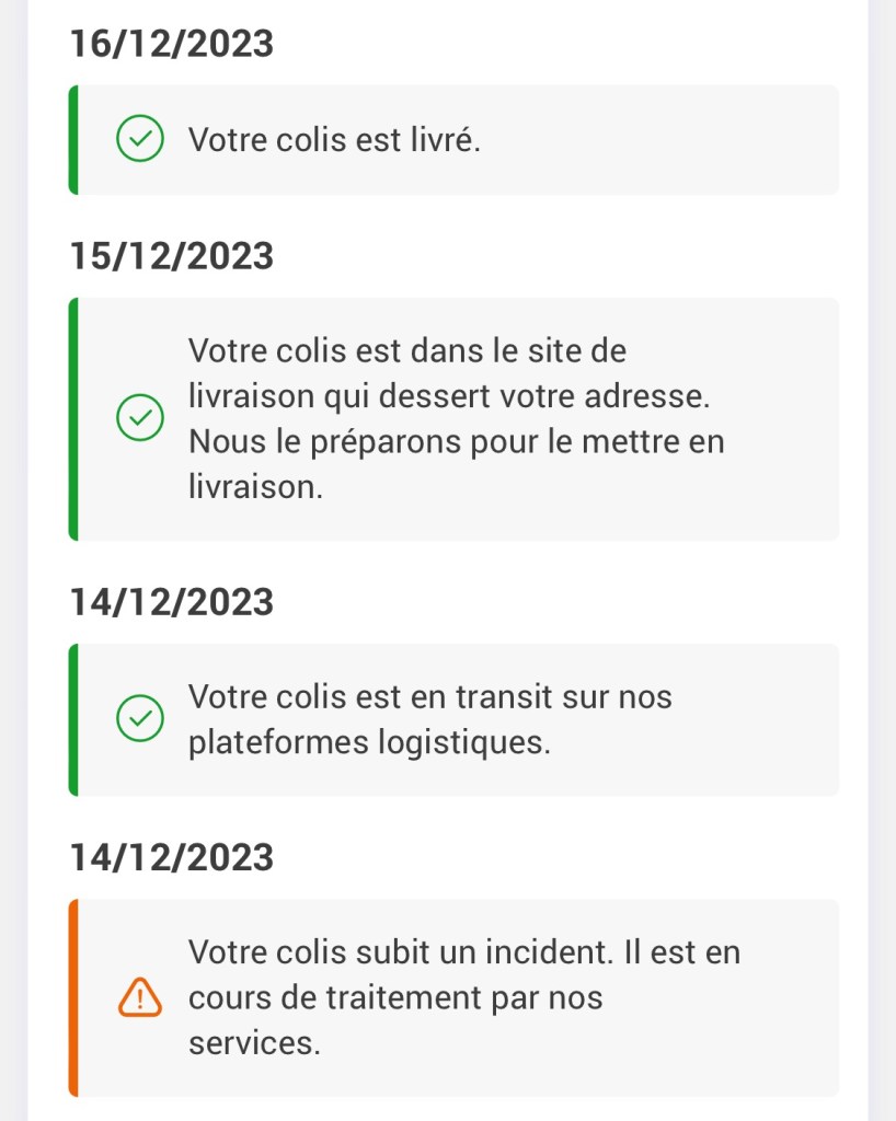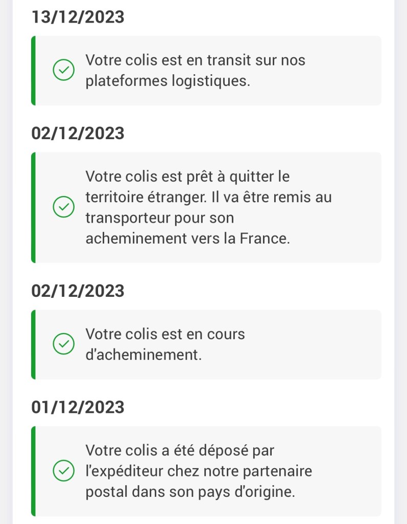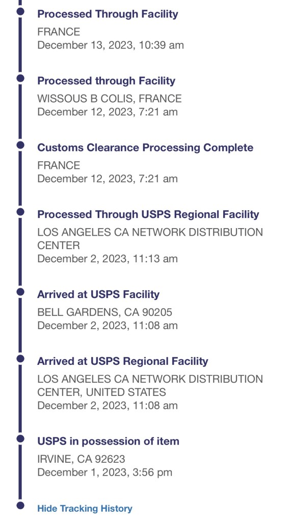 On apprend que le 12 décembre, le colis a passé par « Wissous B Colis ». Selon un article que j’ai trouvé, c’est le plus grand centre de tri de toute la France. Le 14, jour de l’incident sans nom, on apprend seulement qu’il a été tenu dans une « office de livraison ». Il y a beaucoup plus de notes ; or, il n’y a pas plus de détails utiles. Mais ils ont du recevoir ces notes de La Poste ; votre « service » sait beaucoup plus sur l’état de vos colis qu’il vous en mentionne.