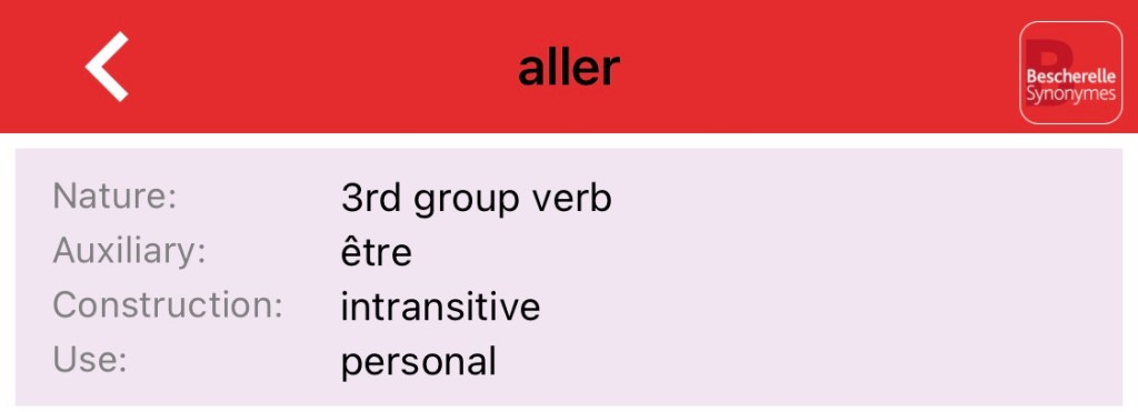 Alors, celui-ci est un verbe du premier groupe. Mais ça veut dire quoi exactement ? Est-ce comme le japonais, où on utilise des numéros différents pour compter selon la signification d’un mot ? Ou peut-être que c’est-à-dire que le verbe est transitif ? Ou transitif mais prend seulement un objet ? J’sais pas moi. Voilà, voici un verbe d’un autre groupe :