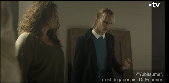 Astrid et Raphaëlle se rendent sur scène, et Astrid explique aux enquêteurs que l’on a coupé le doigt à M. Kimura, une tradition des yakuza — pourtant, M. Kimura n’est pas tatoué, donc pas yakuza lui-même. Jusqu’ici, je sais de quoi on parle. Mais j’ai fait deux ans d’études de japonais à la fac.