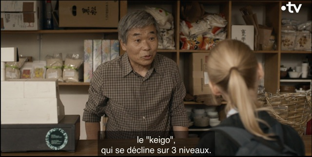 Astrid va dans une épicerie japonaise où un M. Tanaka est le propriétaire. Il remercie Astrid pour l’avoir parlée en japonais — mais la corrige, car il dit qu’elle lui a adressé de manière trop polie. Il explique l’idée de keigo, la politesse et formalité dans la grammaire japonaise. Son explication est un peu trop simplifiée, mais le bon niveau pour une diffusion de ce genre. Pourtant, comment est-il arrivé qu’Astrid aurait seulement appris le niveau le plus formel, ce qui n’est pas la première choose que l’on apprend ? J’ai trouvé ça irréaliste.