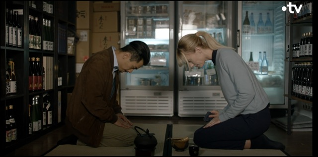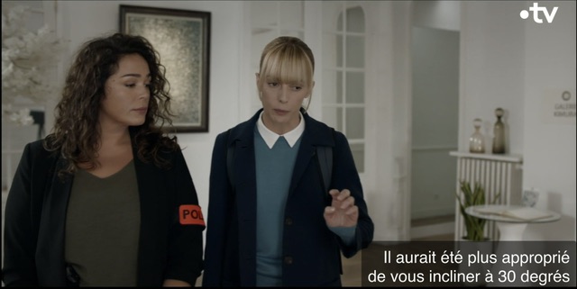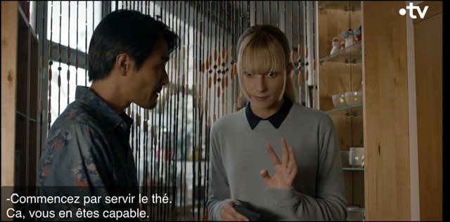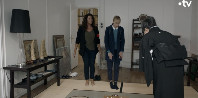 Astrid et Raphaëlle visitent la maison des Kimura pour parler avec Hitomi, la veuve. Elle refuse de parler avec Raphaëlle, qui s’est trop penchée. Astrid mène donc la conversation. Encore une fois, un peu irréaliste. Je vous ai parlé du fait qu’à mon tout dernier arrêt pendant mon premier voyage en France, j’ai oublié de dire bonjour à la femme au guichet de la Grande Arche de La Défense. C’était la seule fois de tout le voyage. Et elle faisait semblant de ne pas m’entendre jusqu’au moment où je me suis rendu compte de mon erreur. Puis, elle m’a parlé seulement en anglais. J’ai des nouvelles pour vous. Les Japonais sont moins têtus que les Français à cet égard.* Au Japon, oui, ça peut arriver. Mais en tant qu’expatrié, en parlant avec un gaijin (non-japonais) qui exerce de l’autorité légitime ? Jamais.