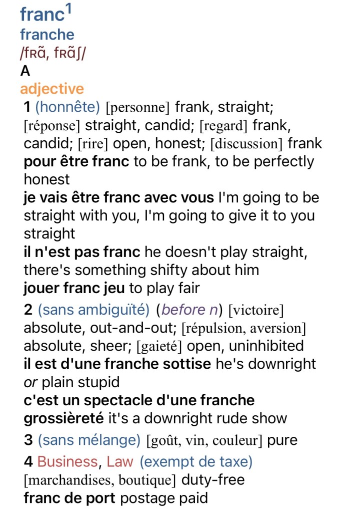 Mais ça m’a rendu curieux. « Free » veut dire plutôt « libre » (il y a aussi un autre sens de gratuit), et franc est tout autre chose. Mon dictionnaire Oxford a beaucoup de choix, mais franchement, le bon rapport n’est pas évident :