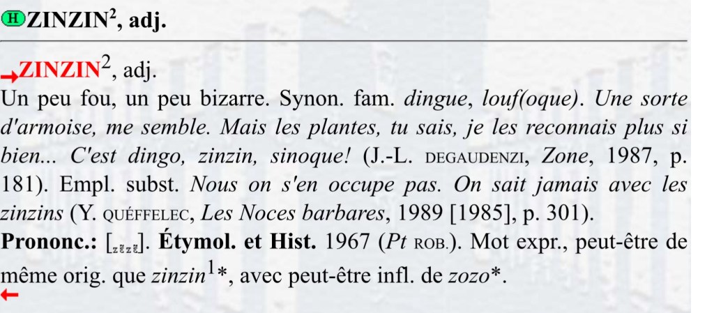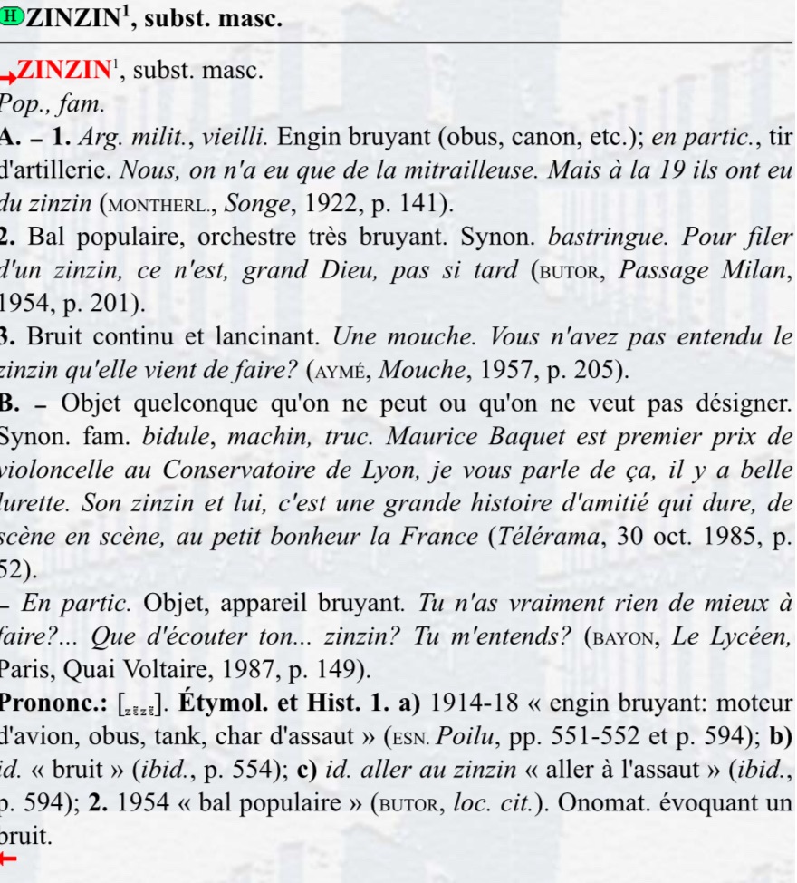 Je ne connaissais pas le mot « zinzin », mais j’ai tout de suite pensé au mot le plus proche que je connaisse, « zizanie ». J’ai donc recherché zinzin dans le Trésor de langue française :