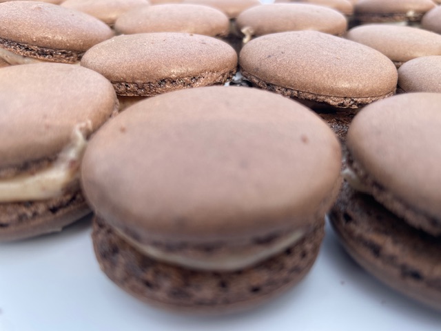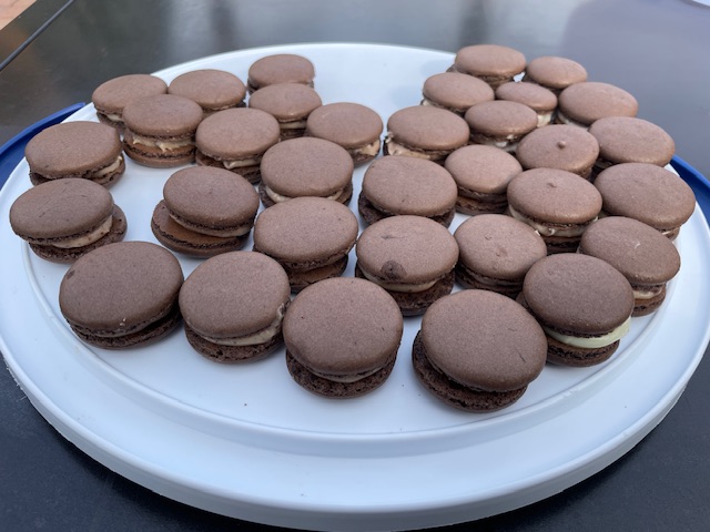 Je ne vais pas écrire une recette dédiée, mais je vous avais dit que j’ai fait les TKOs afin de faire tout autre chose. Voilà — j’ai écrasé quelques biscuits, mis les miettes dans de la ganache, ajouté de la vanille liquide, et utilisé le tout pour remplir des macarons. Tout ça, c’était du travail. Mais je dois vous dire, c’était une réussite avec les amies de La Fille :