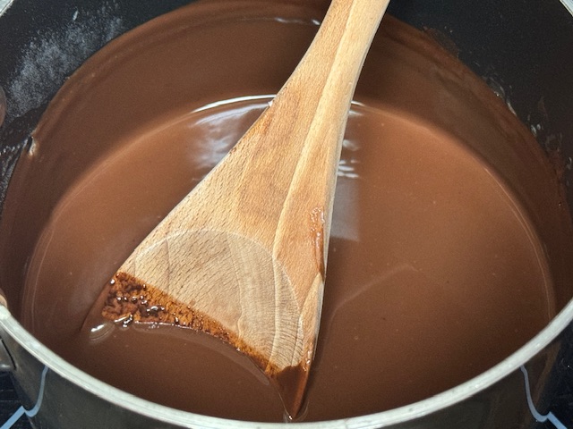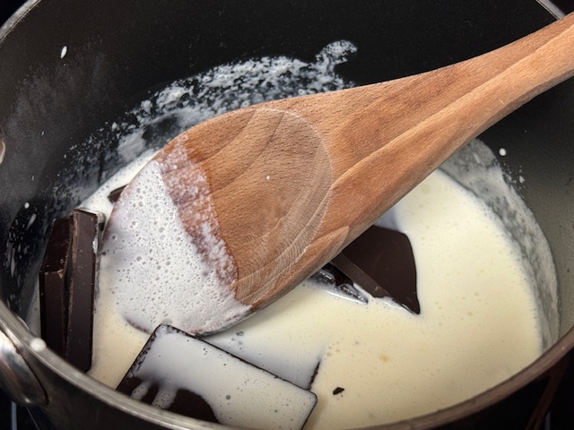 - Une fois que le chocolat est complètement fondu, retirer du feu et ajouter le beurre. Mélanger avec une cuillère en bois jusqu’à ce qu’il soit tout incorporé.