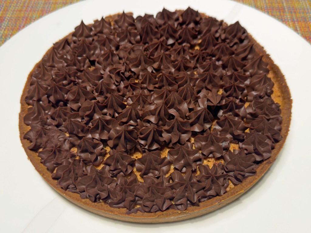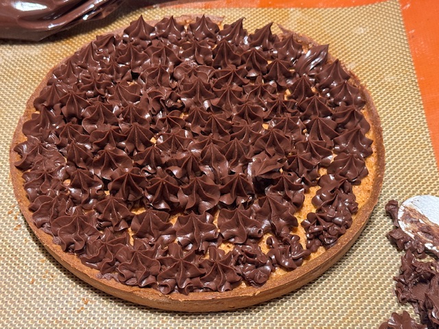 - Faire des cercles de ganache, une petite boule à la fois. Commencer aux bords ; finir au centre. Quelque chose bloquait ma douille, un petit morceau de plastique. J’ai vidé la poche, gratté les boules mal formées de la tarte, et il me restait quand même assez de ganache pour refaire les erreurs. Regardez les photos.