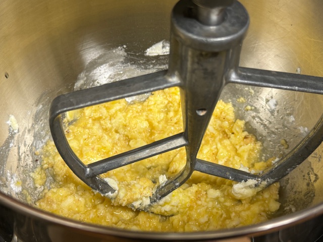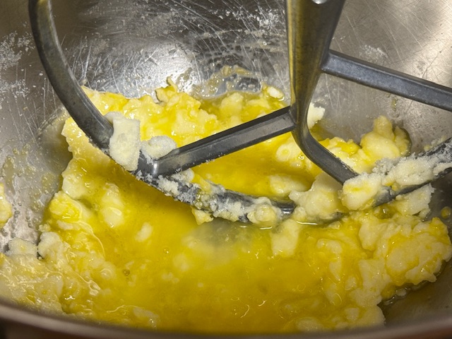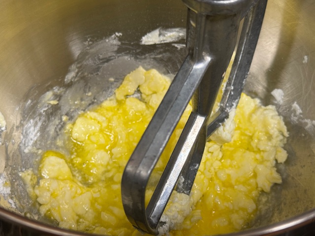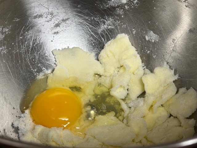 - Mélanger le beurre et sucre dans un robot équipé de la feuille à vitesse moyenne. Ajouter l’œuf et mélancer encore.