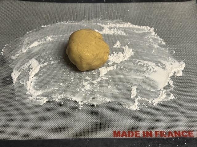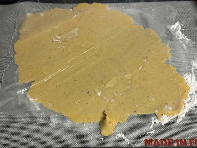 - Préchauffer le four à 170°C. Étaler la pâte sur un plan de travail fariné ; j’ai eu besoin d’une feuille de papier sulfurisé afin de l’étaler assez fine.