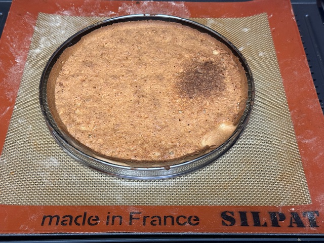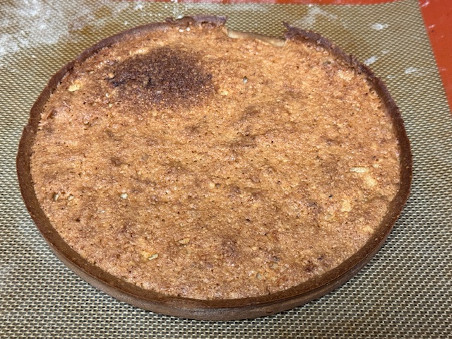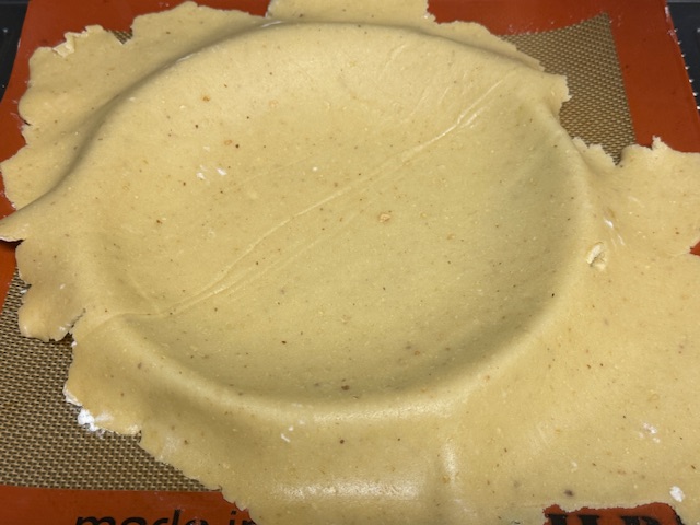 - Foncer la pâte dans un cercle de pâtisserie sur un tapis en silicone et plaque de cuisson — la recette originale conseille 22 cm, mais le mien est 23 et j’ai survécu.