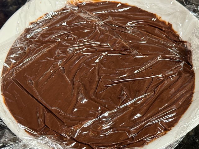 - Verser la ganache dans un bol, couvrir avec du film à contact, puis laisser reposer dans le frigo au moins 1/2 heure. On veut qu’elle reste molle pour pocher, mais je l’ai laissée au frigo pendant presque une heure parce que la ganache restait toujours trop liquide après 1/2 heure. Attention, le glucose retardera le durcissement de la ganache, alors il faut la surveiller.
