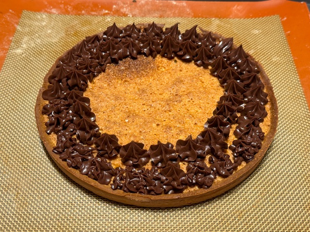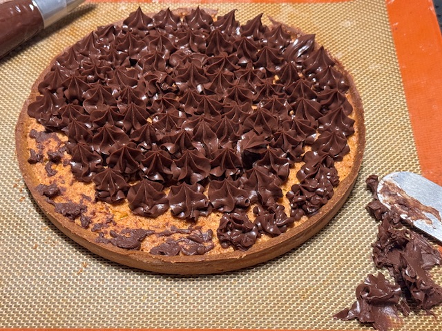 - Faire des cercles de ganache, une petite boule à la fois. Commencer aux bords ; finir au centre. Quelque chose bloquait ma douille, un petit morceau de plastique. J’ai vidé la poche, gratté les boules mal formées de la tarte, et il me restait quand même assez de ganache pour refaire les erreurs. Regardez les photos.