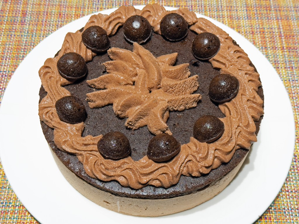 1. Laisser figer 4 heures de plus. Retirer le rhodoïd. Pocher la ganache montée (j’ai utilisé deux douilles — une Saint-Honoré et une etoile) et décorer avec des demi-sphères de biscuit au chocolat.