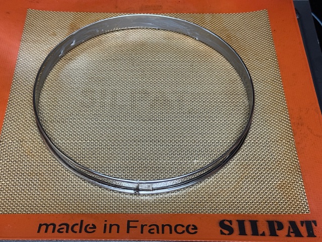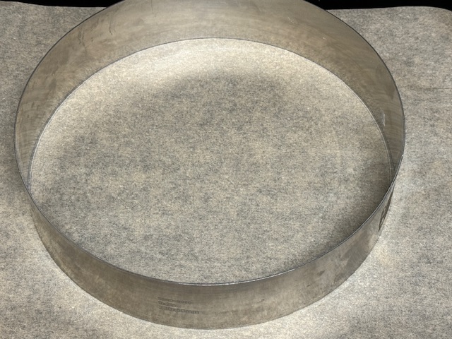2. Beurrer un cercle de pâtisserie de 22 cm et le mettre sur une plaque de cuisson recouverte d’un tapis en silicone.