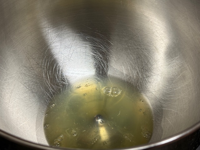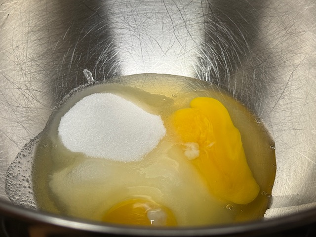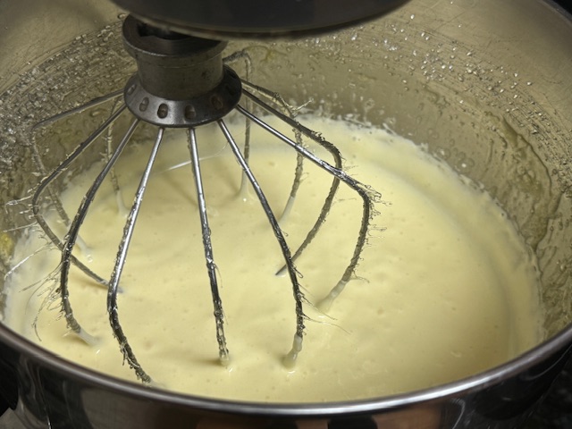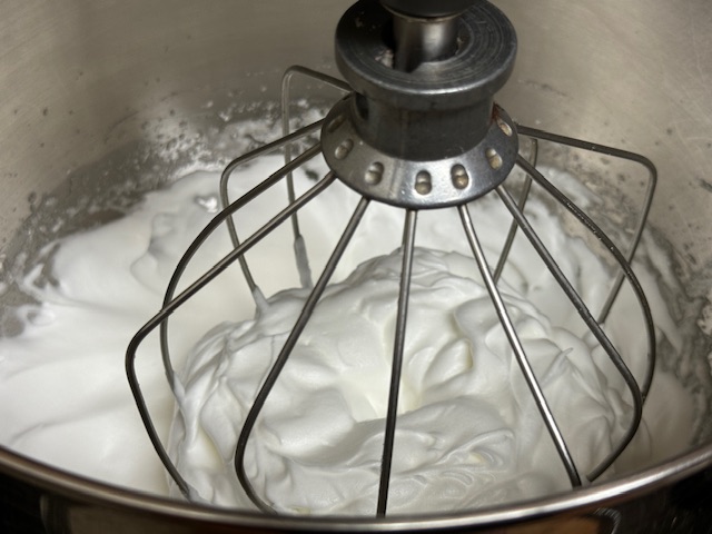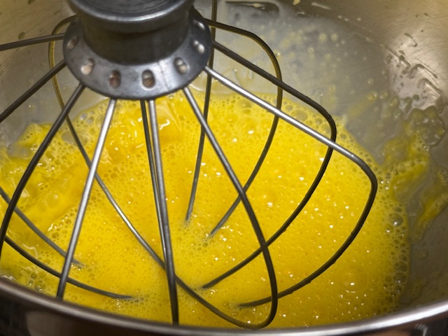 1. Cuire l’eau et le sucre à 125 °C, puis verser ce sirop en filet sur les oeufs et continuer à battre. Fouetter jusqu’à complet refroidissement. Le volume devrait tripler, plus ou moins.