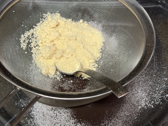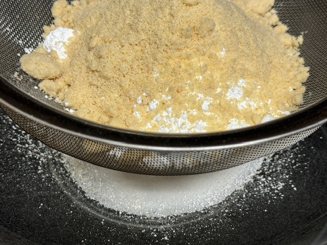1. Dans un saladier, tamiser ensemble les 100 grammes de sucre en poudre, le sucre glace et la poudre d’amande. Ajouter le lait et mélanger bien.