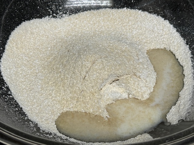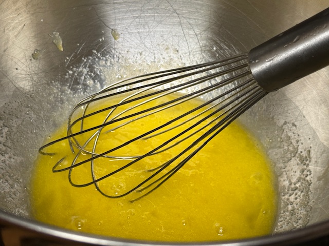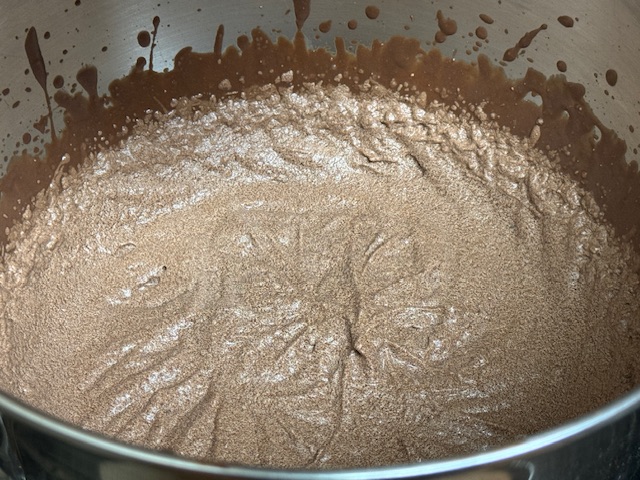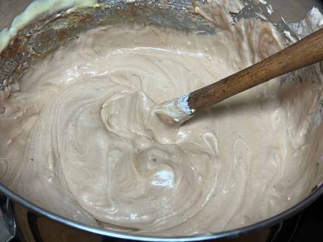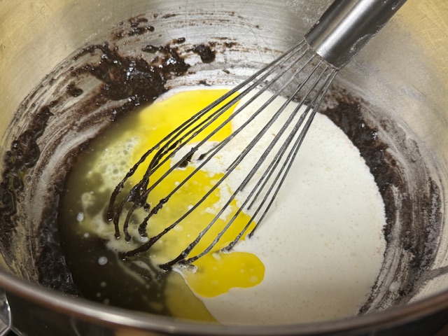 1. Y verser la crème liquide et le beurre fondu et mélanger encore.