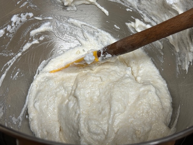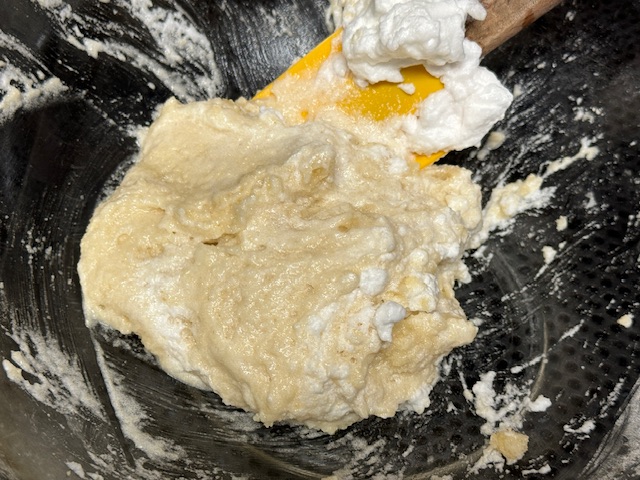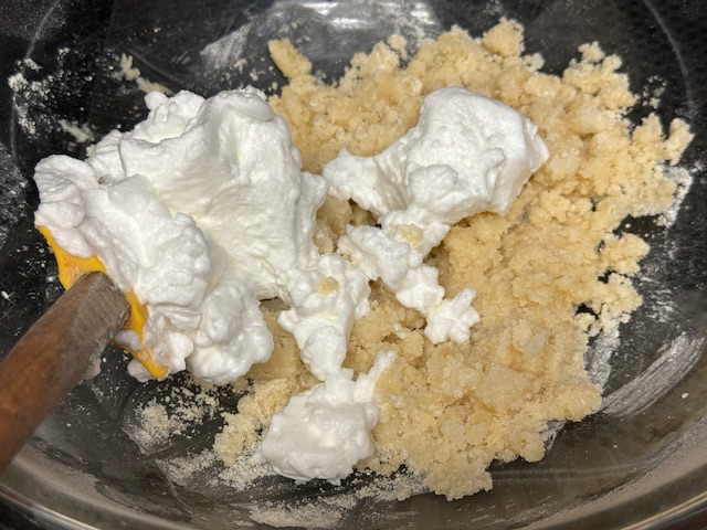 1. Ajouter un peu de la meringue aux poudres et mélanger avec une maryse. Une fois mélangé, ajouter le reste pour tout combiner. Mettre la pâte dans une poche à douille avec une grosse douille lisse.