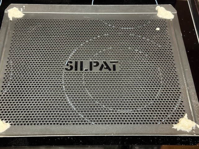 1. Mettre un peu de la pâte aux quatre coins d’une plaque de cuisson. Mettre le papier de cuisson à l’envers sur la plaque — la pâte collera au papier, et le dessin ne touchera pas la pâte. Dessiner un escargot de pâte dans le cercle.