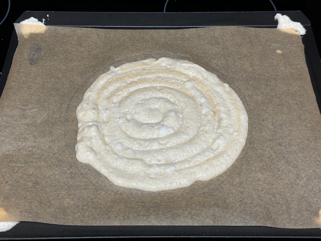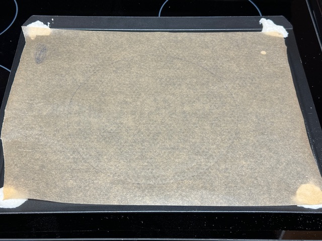2. Sur du papier de cuisson, dessiner un cercle avec l’aide d’un cercle de pâtisserie de 22 cm.